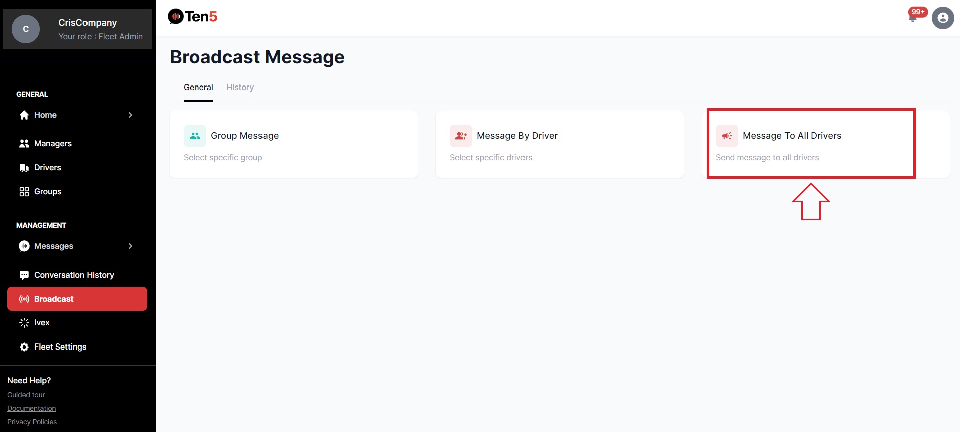 Log in as fleet admin user and on the left side choose the Broadcast option.