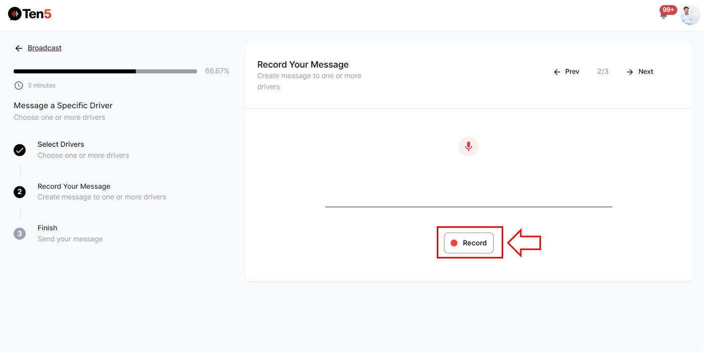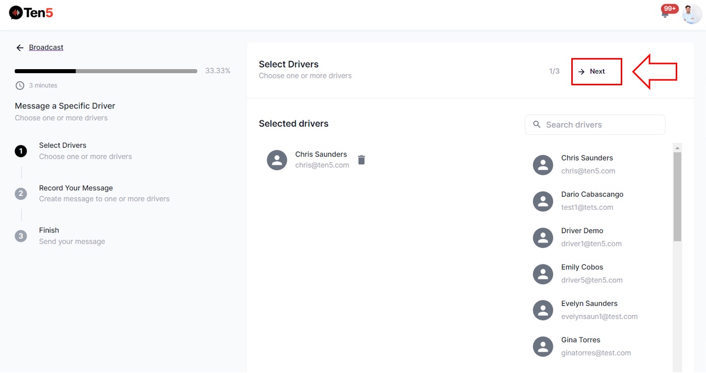 The following page is displayed. Search and select one or more drivers to send the message to. Then click on the Next button to start recording the message.