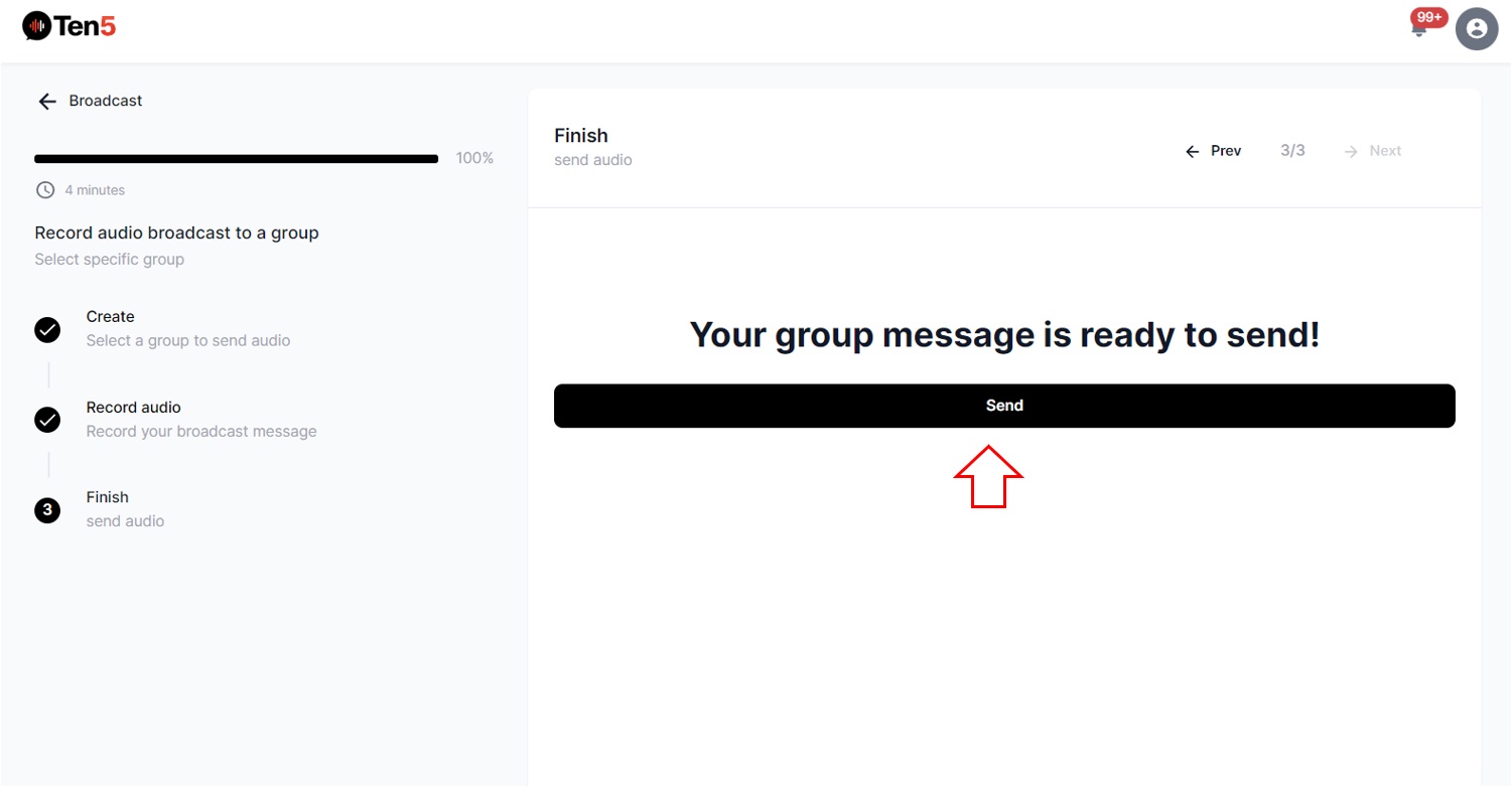 The following page is displayed. Search and select a group to send the message to. Then click on the Next button to start recording the message.