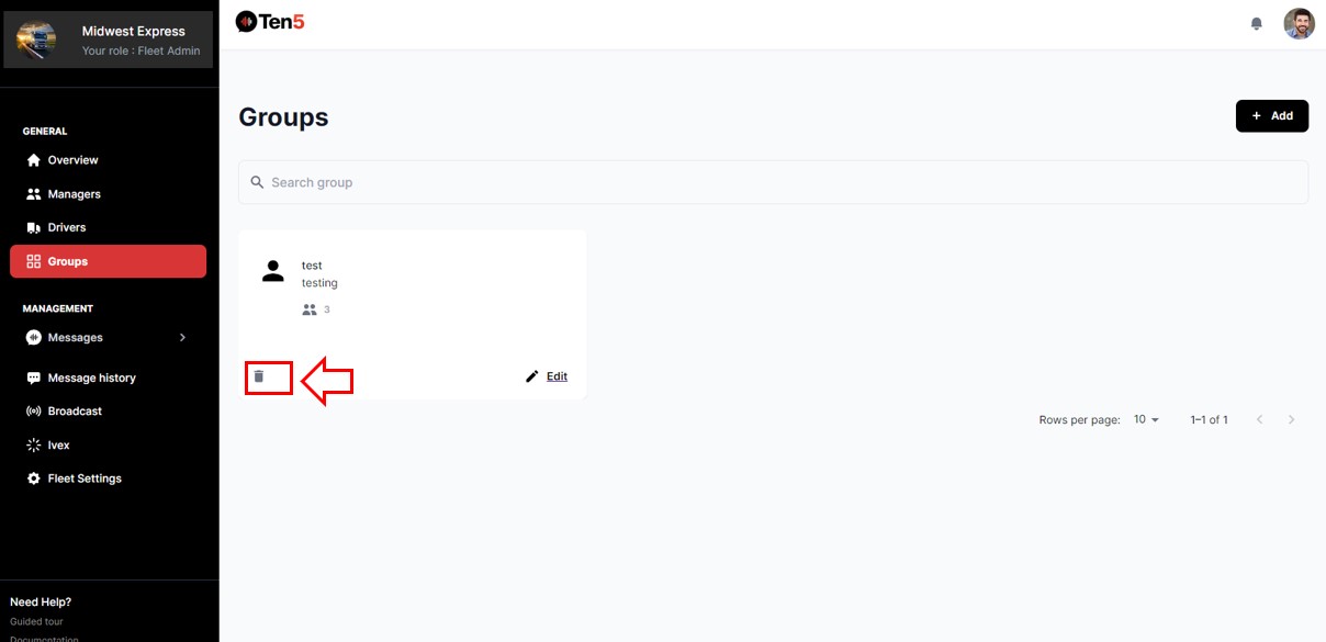 Log in as fleet admin user and on the left side choose the Groups option. In the group to be deleted, click on delete icon button.