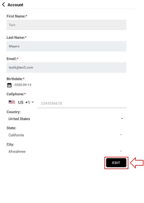 In this view, you can see your information such as: First name, Last name, Email, Birthdate, number cellphone, country, state, and city. To edit the information, click on the EDIT button.