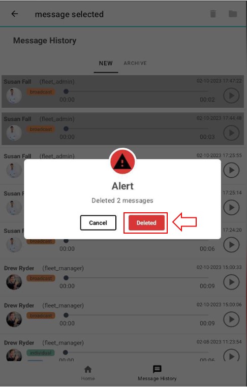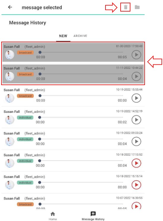 To delete a message, select the messages to delete and press the delete icon at the top. You can select one or more messages to delete simultaneously.