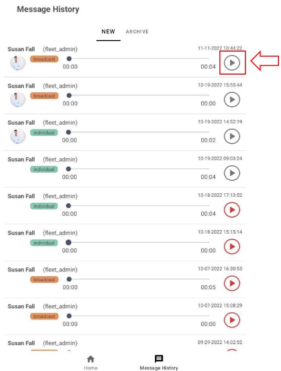To listen to your message, click on the button with the play icon, and the playing begins. If you didn't listen to some messages the icon will be in red.