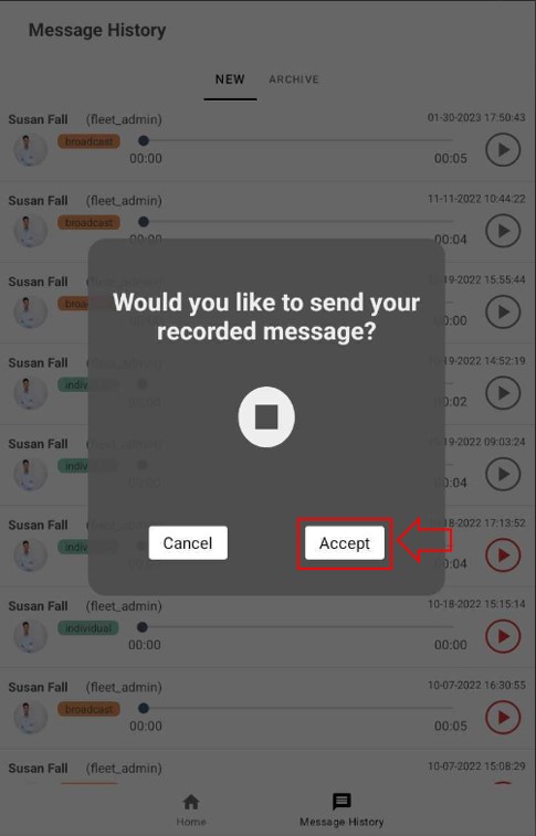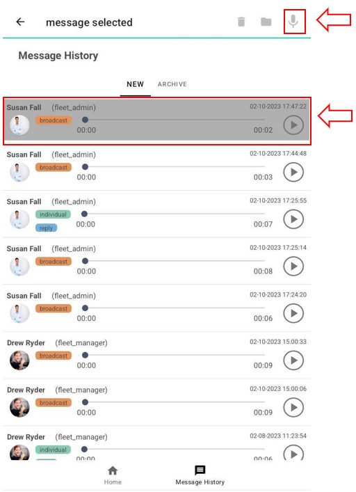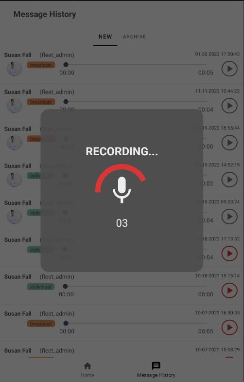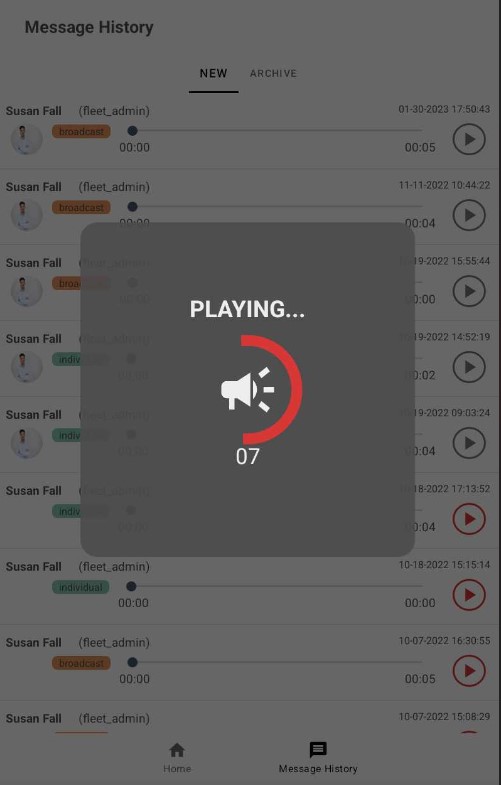 The Message History view has two taps with your message list. The first with your new messages and the second with your archived messages. In each message you can see, who send you the message, the type of message, the date of creation, and the duration of the message.