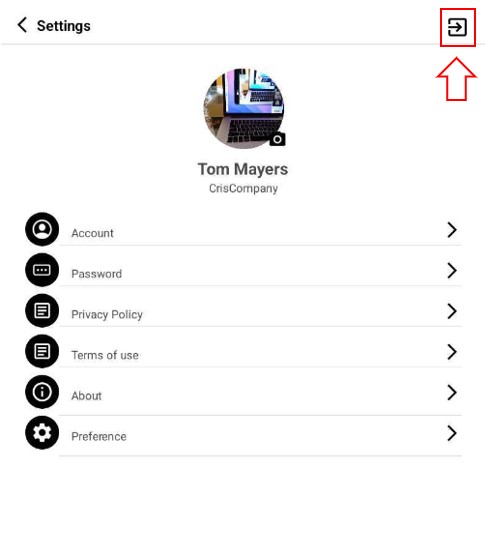 To log out of the application, you must first go to settings by clicking the wheel icon in the Home view.